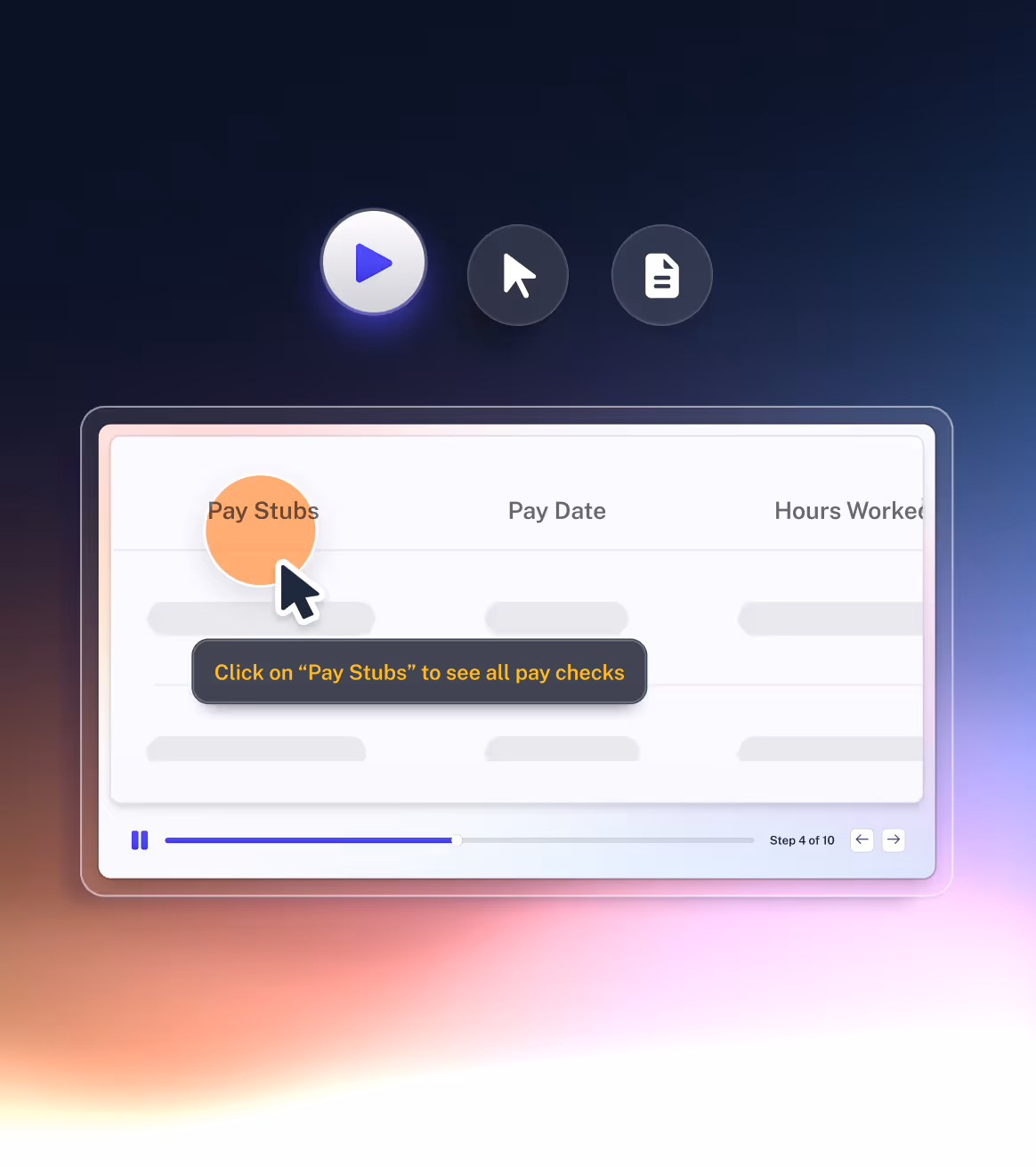 Turn any browser or desktop process into a professional step-by-step guide, with screenshots, text, click targets, and narration.