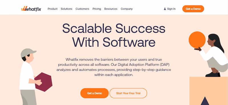 Whatfix's DAP software is another Appcues alternative for specific user onboarding needs. Like Appcues, WhatFix allows you to create guided product walkthroughs and offers in-product surveys and usage analytics.