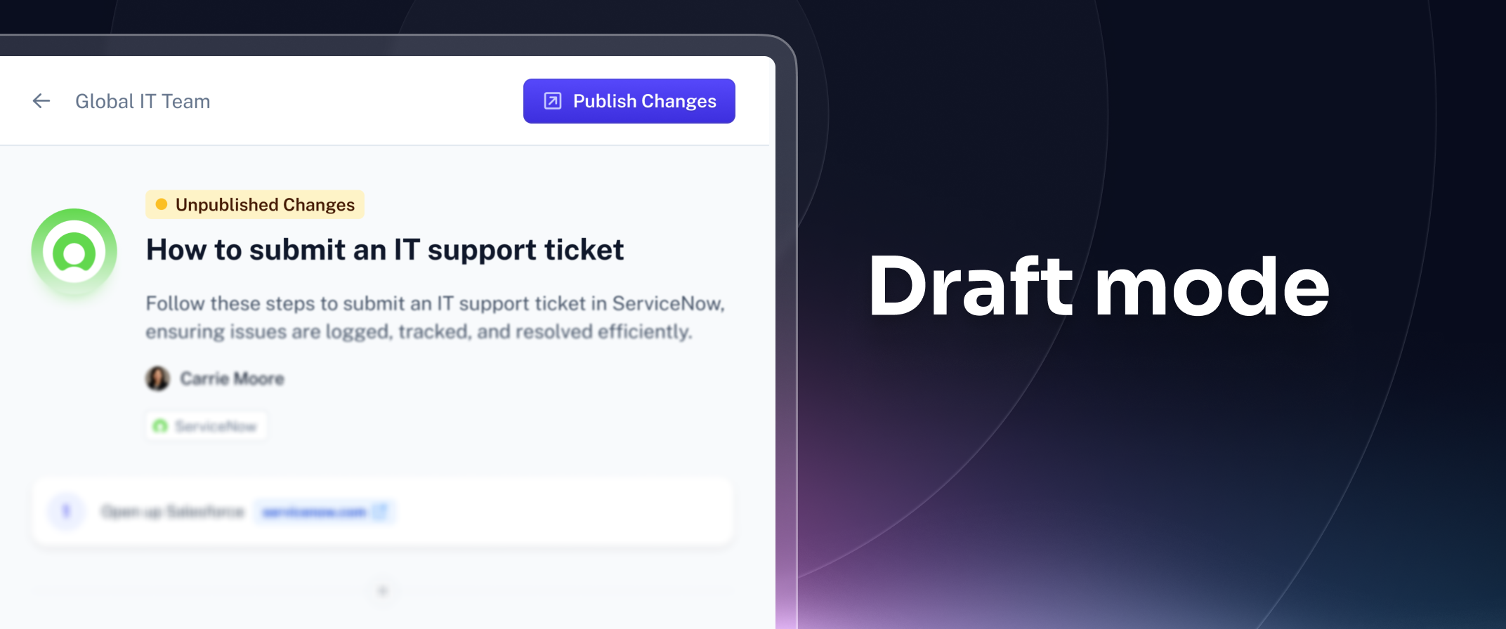 Every update now begins in a private draft, giving teams a safe space to make edits, refine details, and collaborate without unfinished work being automatically made public. Once your content is ready, you can publish knowing it’s polished, accurate, and ready to share across the organization. Draft mode prevents errors, and helps teams avoid compliance slip-ups, keeping your documentation consistently reliable.