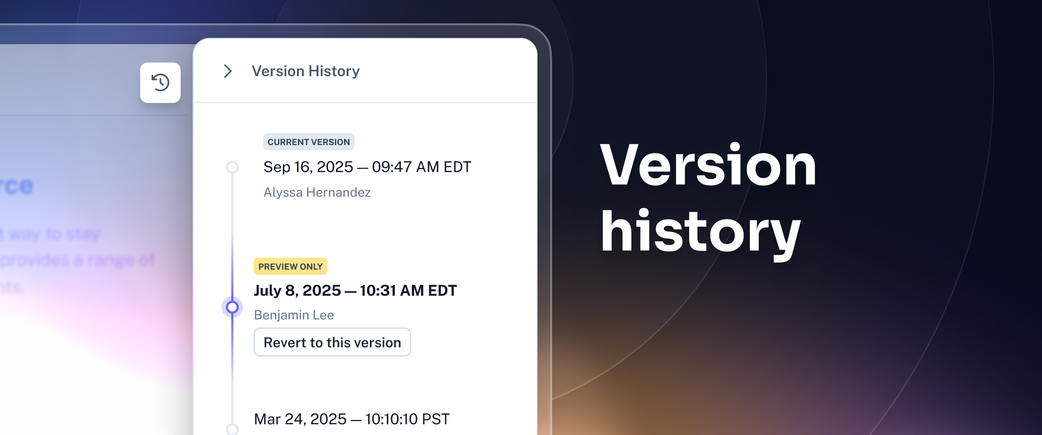 With version history, you get a built-in safety net that ensures you always have a reliable record to fall back on. This transparency provides a full audit trail, keeps everyone accountable, and makes it easier to roll out (or roll back) changes across the organization.