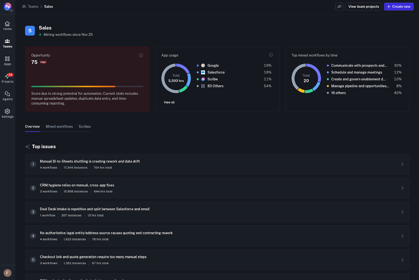 Using Scribe Optimize, Ryan’s team can avoid this entirely. Ryan can see exactly where sellers are bogged down by manual deal desk tasks or redundant Salesforce entries. Optimize provides a specific, objective third-party recommendation that validates exactly what the team is feeling on the ground.