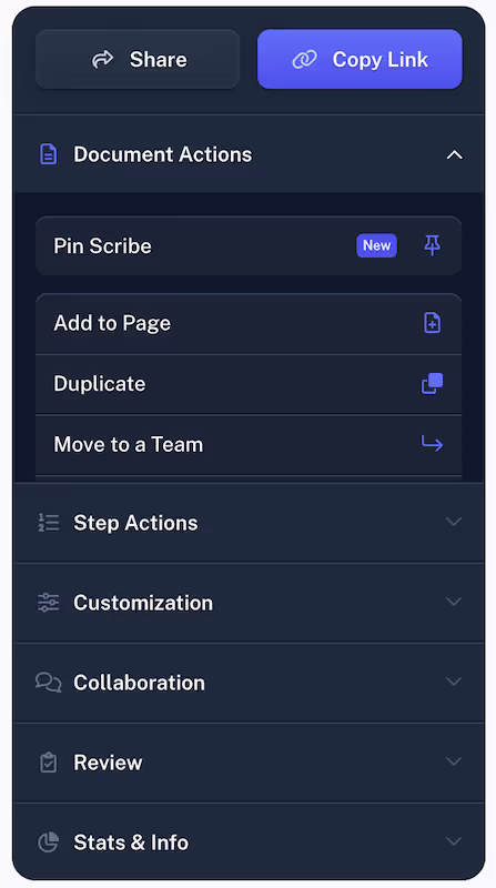 You can share your guide with your team by adding them to your Scribe workspace, sharing the guide via a link, or embedding it in your documentation. You can also export your guide to interactive PDF, HTML or Markdown.