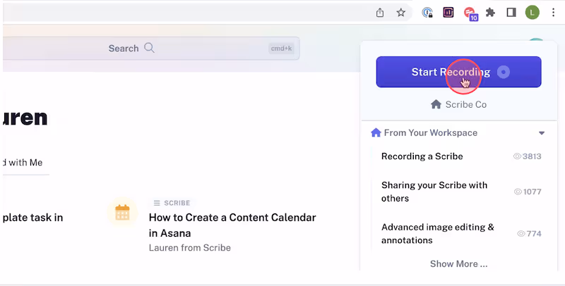 Once you’ve installed Scribe, navigate to the process that you want to document and click on the Scribe icon in your Chrome toolbar.