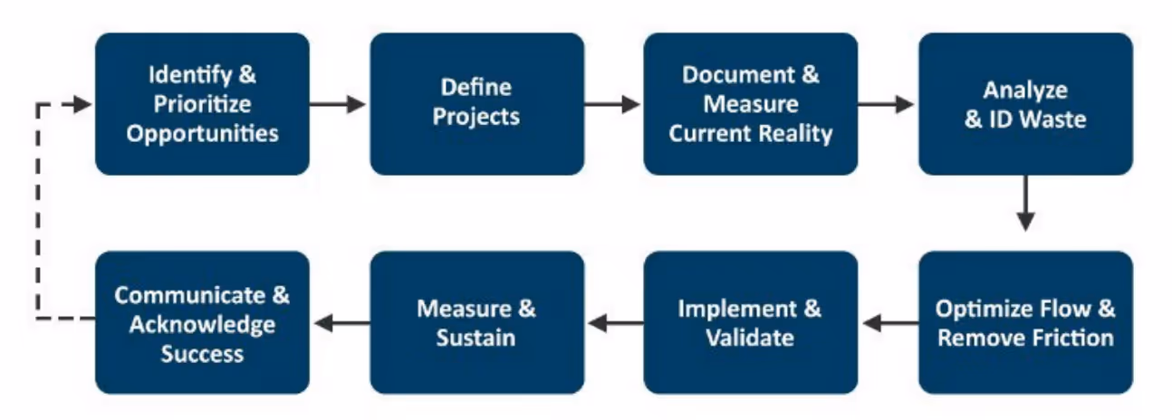 The framework starts with process mapping and evolves into continuous monitoring and improvement.