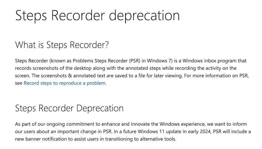 In late 2023, Microsoft announced that they would be deprecating Windows Steps Recorder (also known as Problems Steps Recorder or PSR) in 2024.