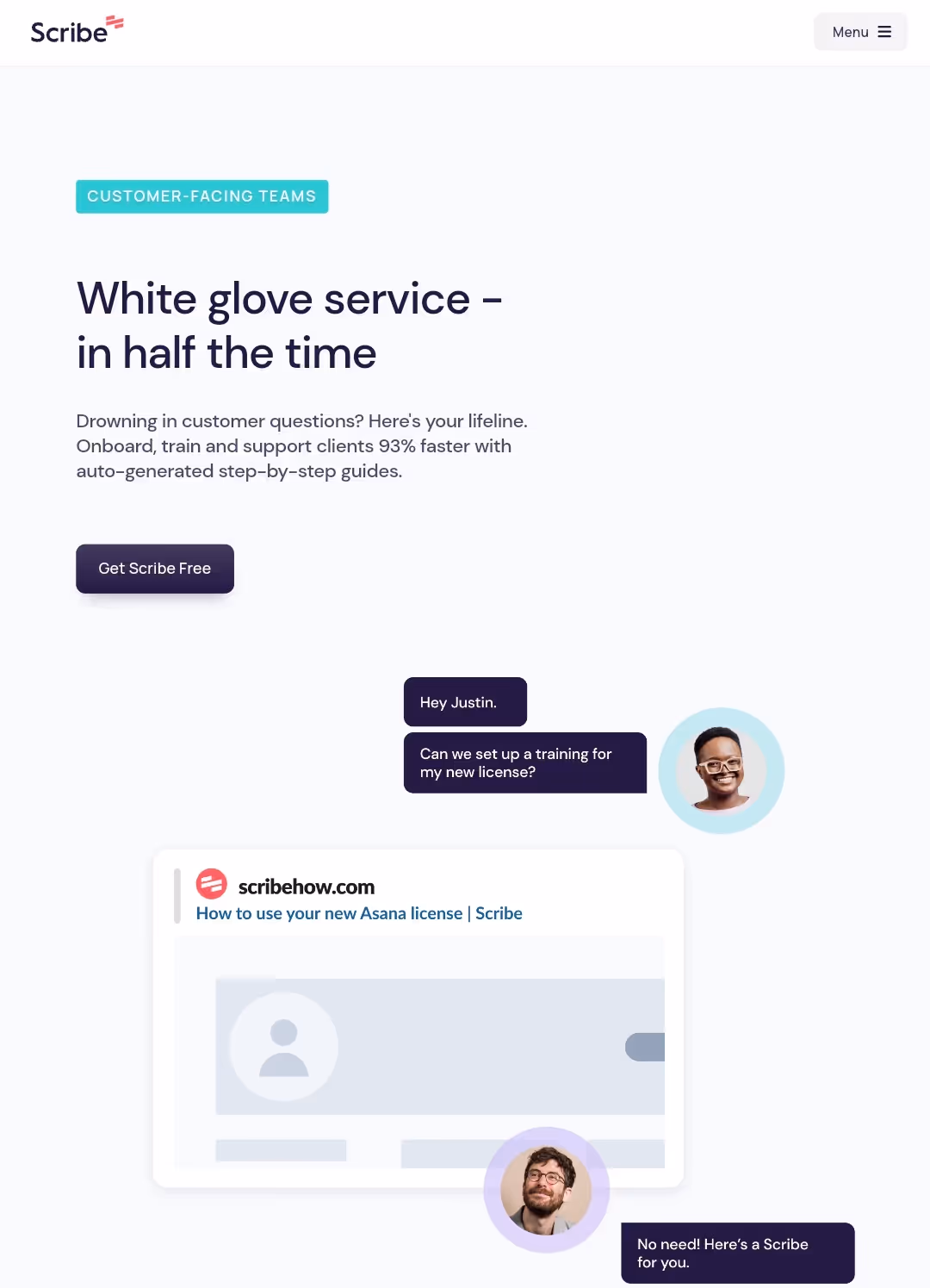 - Reduces ad hoc customer questions by putting an end to the hours spent answering customer questions with Scribe’s automatic guide creation and library.