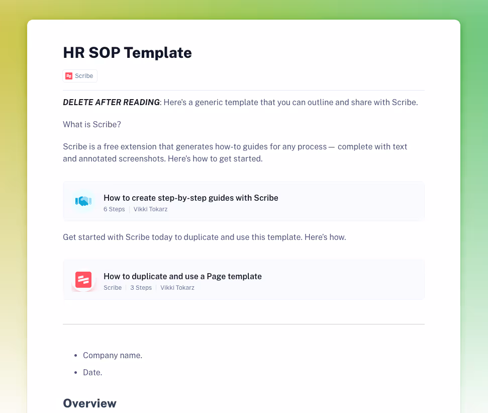 An SOP format is a repeatable, reliable structure for creating step-by-step procedural instructions. There are several SOP examples you can learn from, such as those you’ll find in the Scribe Gallery. Once you understand how SOPs work, you can create a reusable standard operating procedure template for your human resources department or any team that needs one.