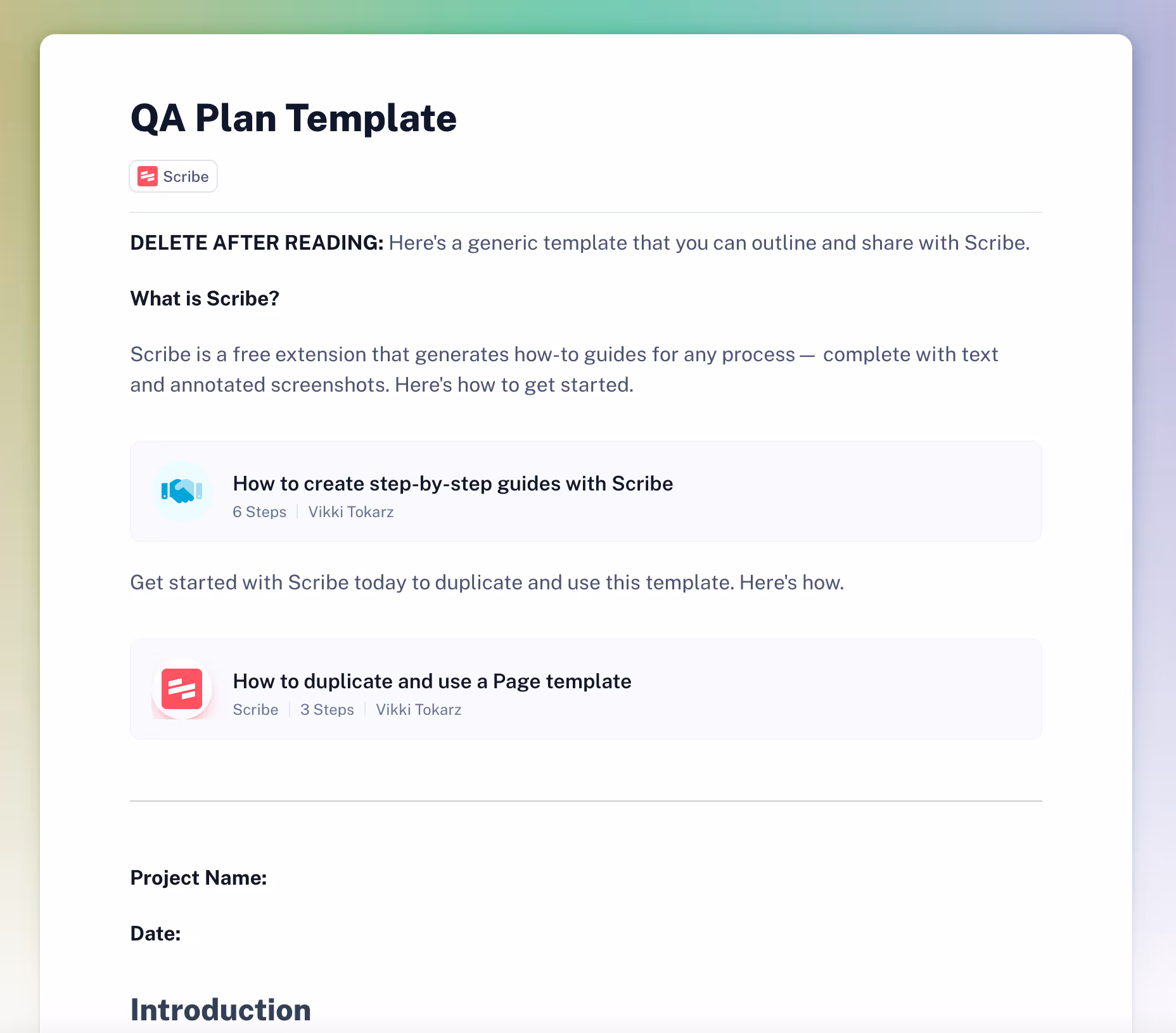 The introduction is a summary of the QA plan’s boundaries and goals. It’s generally separated into purpose, scope and objectives, providing a reference for your team to keep them aligned and focused throughout the project.